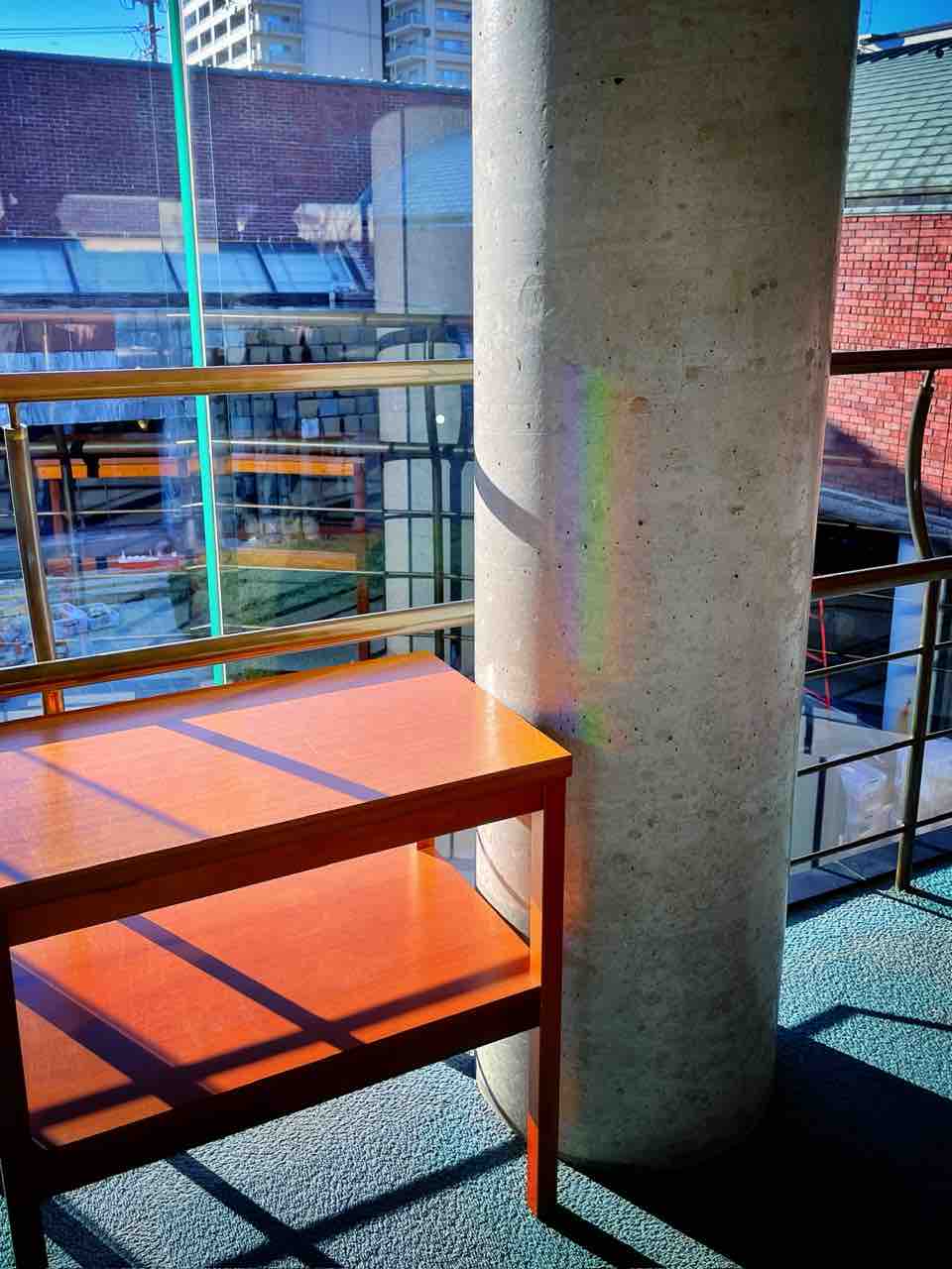 それはただ、窓ガラスの角が日差しを受けてプリズムになって柱に映っているだけ。